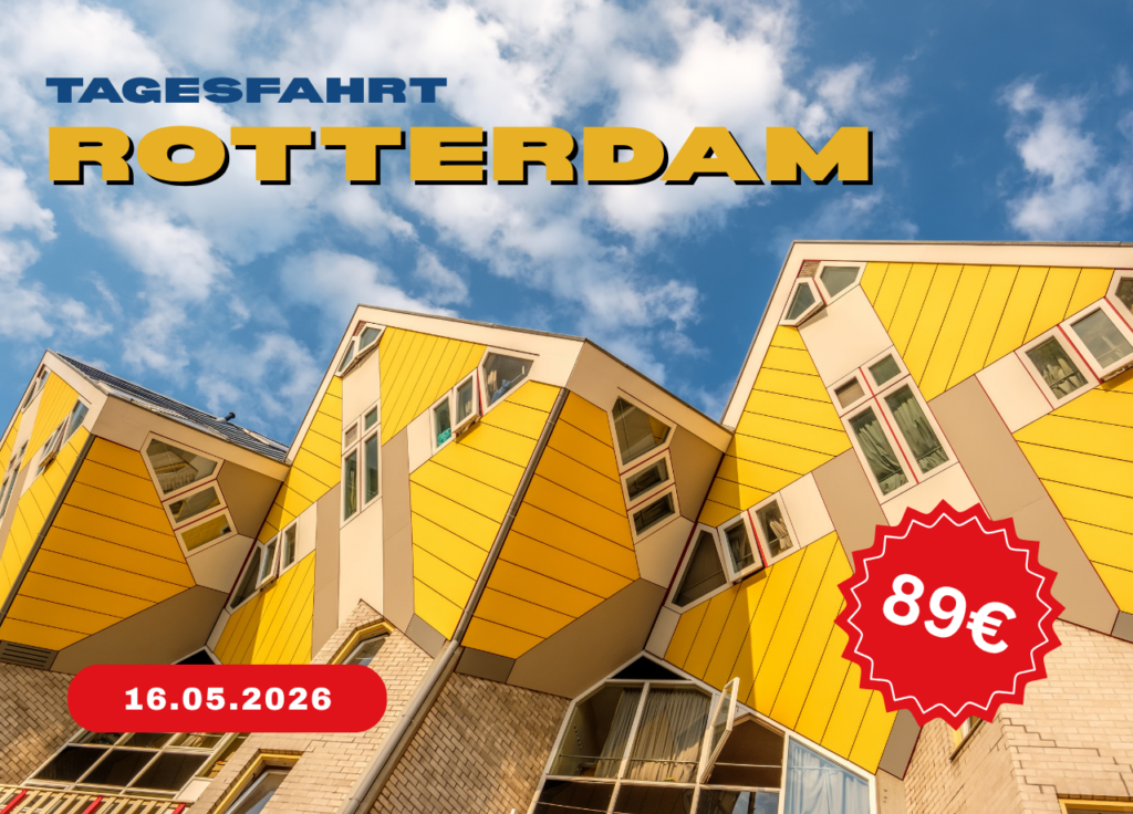 WEITERLESENErlebe Rotterdam an einem Tag! Freu dich auf moderne Architektur, die beeindruckende Markthal und die berühmten Kubushäuser. Genieße entspannte Stunden am Wasser und entdecke die Stadt ganz in deinem eigenen Tempo. Jetzt Platz sichern ab 89€ 🚍