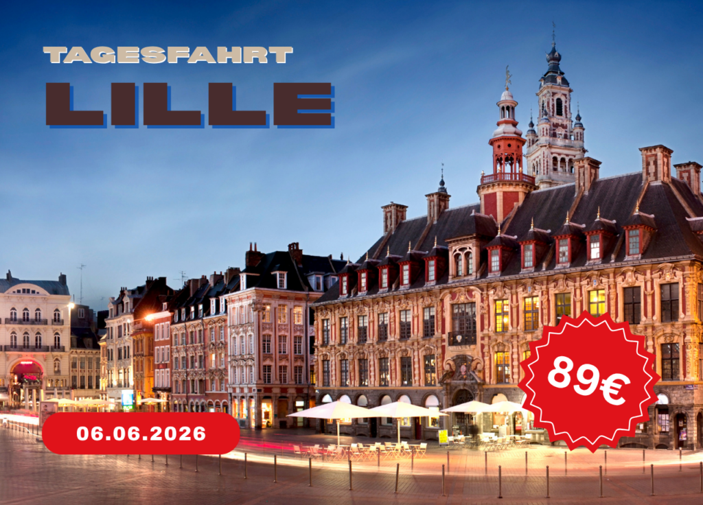 WEITERLESENEin Tag wie in Frankreich! Entdecke Lille mit seiner charmanten Altstadt, kleinen Boutiquen und gemütlichen Cafés. Genieße französisches Flair und entspanntes Bummeln – jetzt Platz sichern ab 89€ 🇫🇷✨