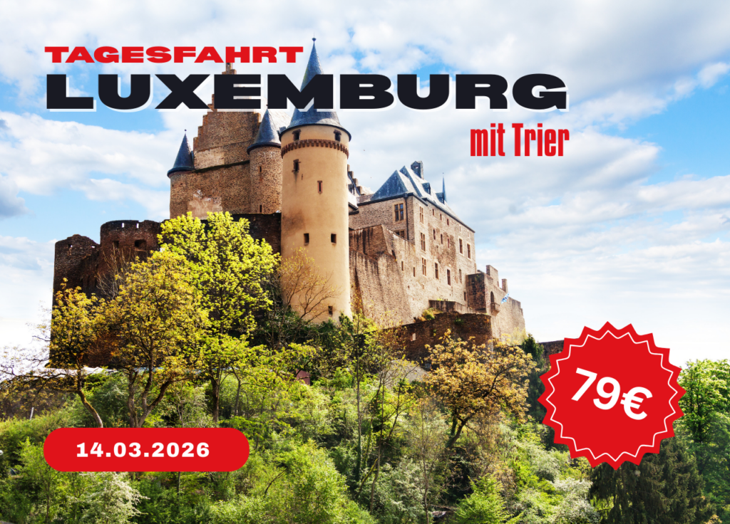 Unsere Reise startet früh am Morgen: Um 06:00 Uhr fahren wir im Ruhrgebiet los und erreichen gegen 10:00 Uhr die vielseitige Hauptstadt Luxemburgs. Nach der Ankunft steht euch der Tag zur freien Verfügung – perfekt, um Luxemburg ganz in eurem eigenen Tempo zu erkunden.